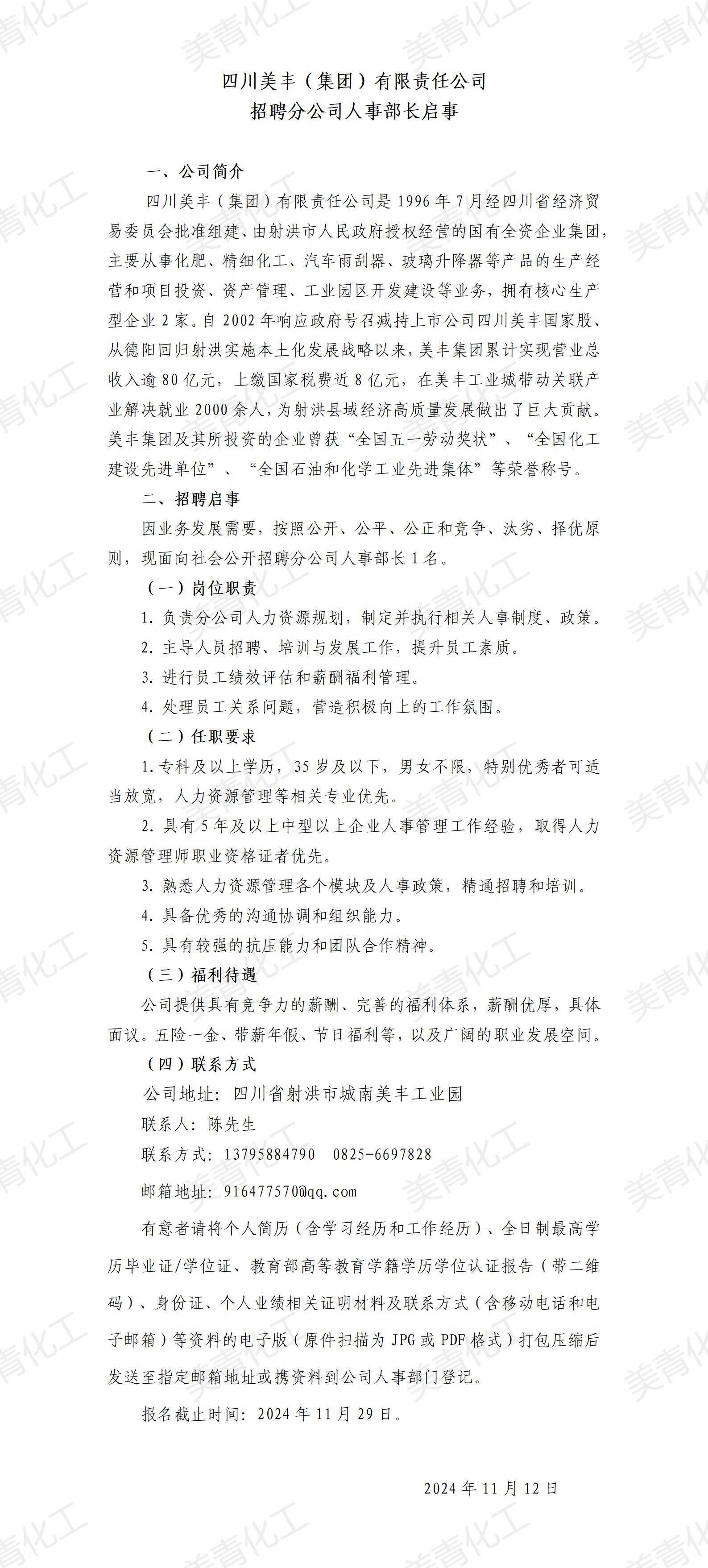 招聘分公司人事部長啟事