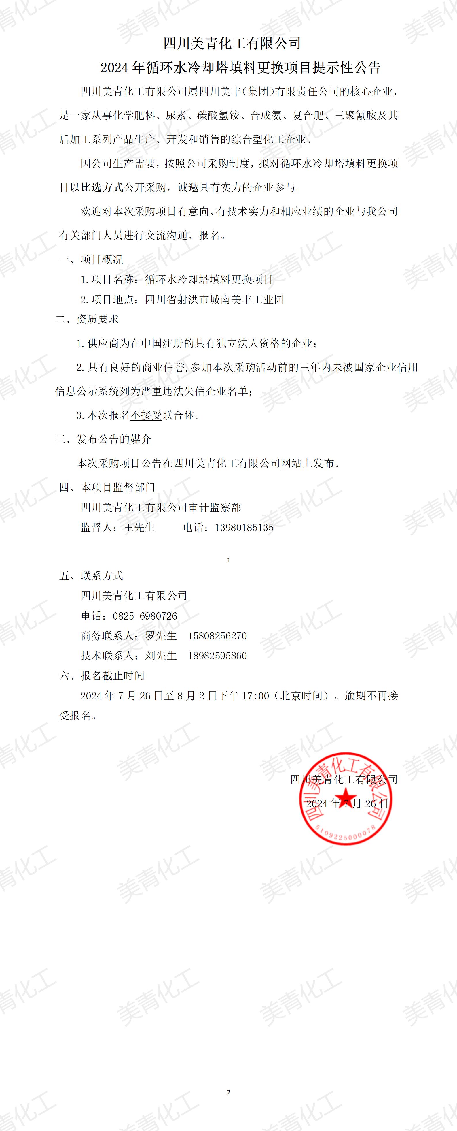 2024年循環(huán)水冷卻塔填料更換項目提示性公告