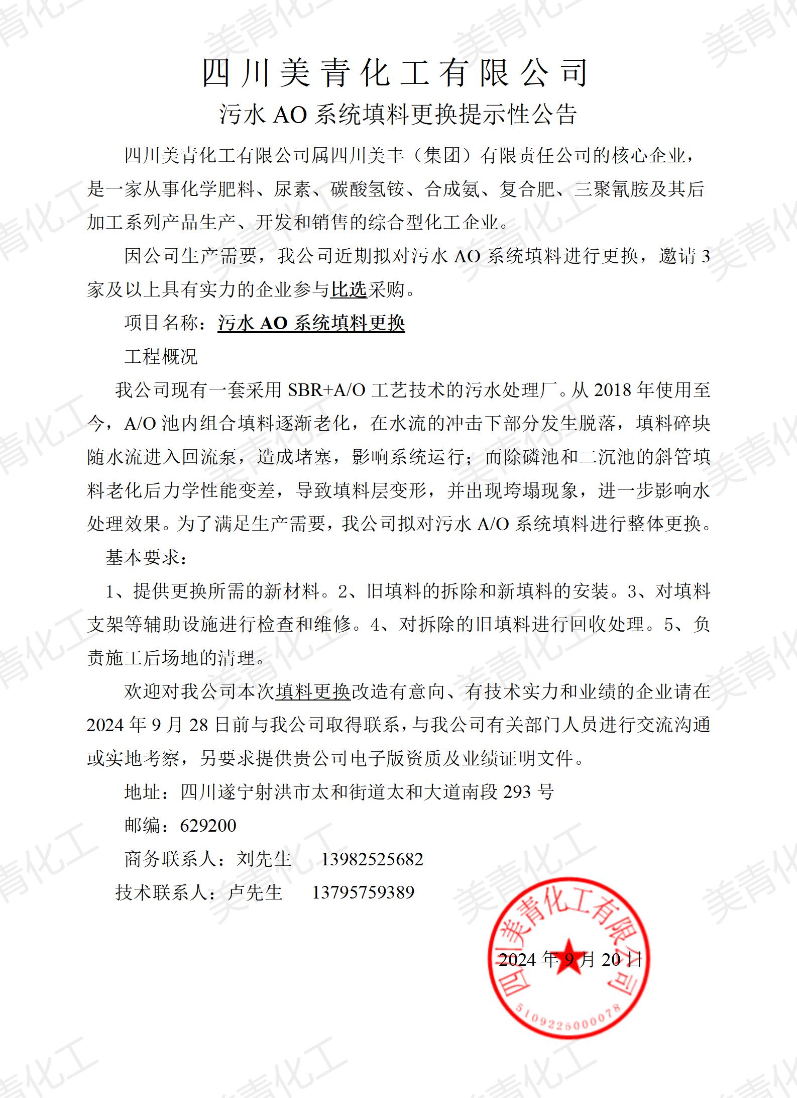 污水AO系統(tǒng)填料更換提示性公告